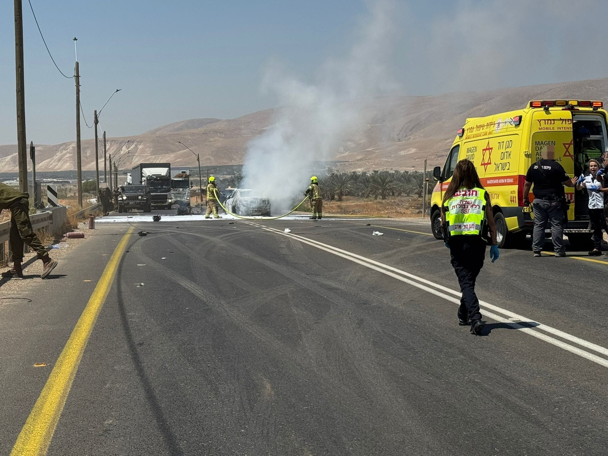 מוטי אגאי מפקד צוות כב”ה: “עם ההגעה למקום זיהינו אופנוע ורכב פרטי העולים באש, ולצידם שני רוכבי האופנוע שוכבים מחוסרי הכרה. מייד התחלנו בפעולות לכיבוי כלי הרכב בעזרת קצף, תוך שאנו שומרים על בטיחות כלל הצוותים הפועלים בזירה. במהלך כיבוי הרכב הפרטי החלו פיצוצים של תחמושת שהייתה ברכב, וביצענו כיבוי ממרחק עד שהתאפשר להתקרב לרכב לטובת כיבוי מוחלט וזיכוי הזירה. מדובר בזירה קשה ומורכבת בה נדרשנו לפעול במשנה זהירות ובו זמנית לחתור למגע עם האש, זאת כדי למנוע פגיעות נוספות בנפש”.